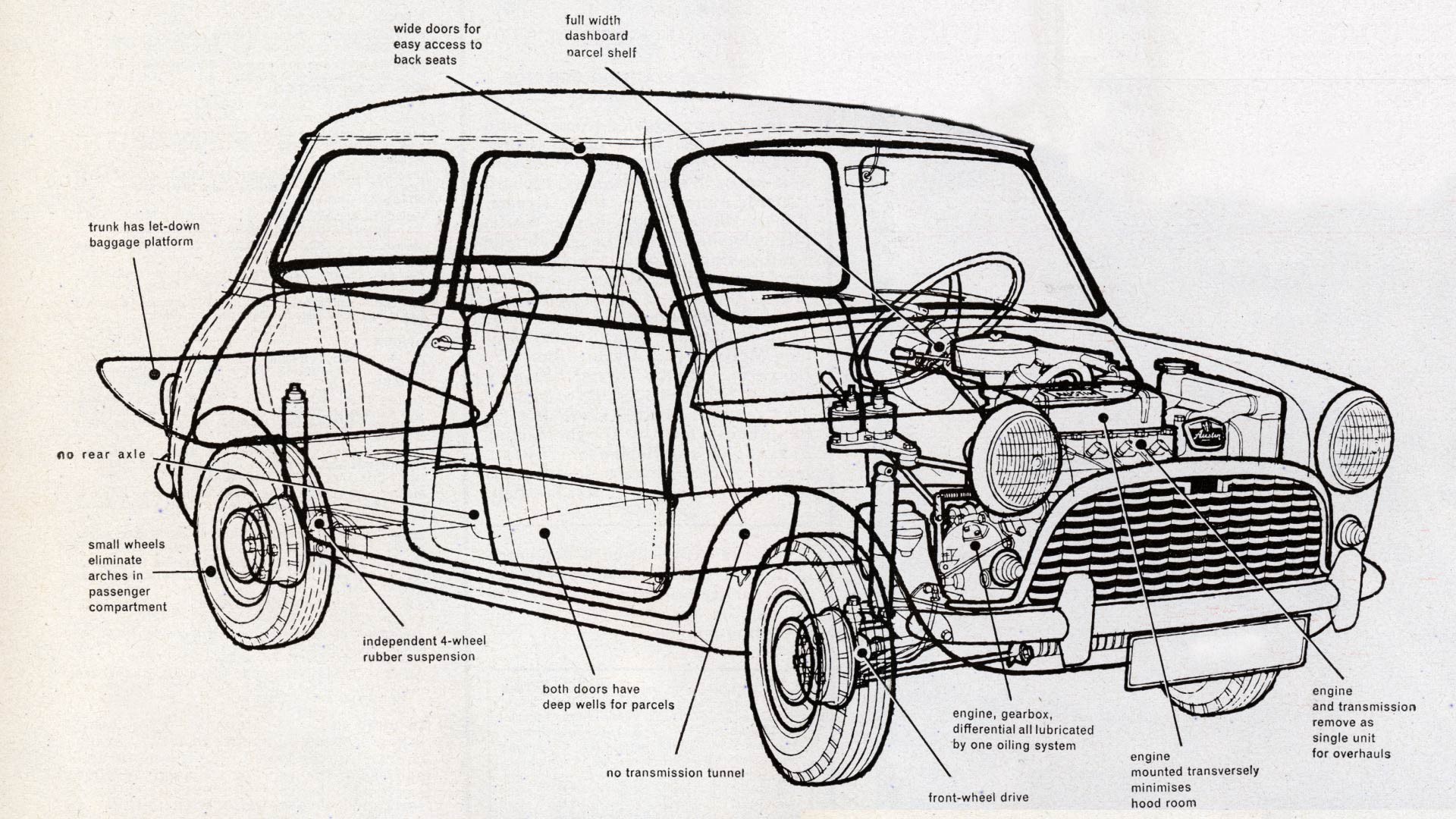 スエズ危機に伴う石油価格急騰によって、経済的な車が求められる。エンジニアのサー・アレック・イシゴニスは、横置きエンジン・前輪駆動方式という当時革新的な構造の小型車Miniを開発した。それ以降の乗用車において、前輪駆動が主流になるきっかけとなった。