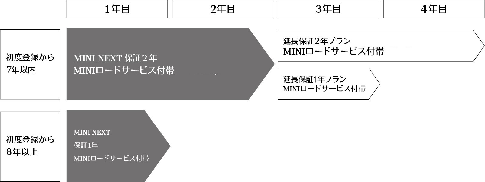 安心のMINI ライフ。 車齢7年まで、最長4年保証