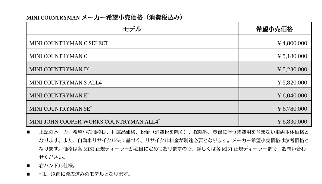 ビー・エム・ダブリュー株式会社(代表取締役社長: 長谷川正敏)は、MINI COUNTRYMAN C SELECT(ミ ニ・カントリーマン・シー・セレクト)、MINI COUNTRYMAN C、MINI COUNTRYMAN S ALL4(エス・オ ールフォー)に48Vマイルド・ハイブリッド・システムを搭載し、本日より全国のMINI正規ディーラー において販売を開始する。48Vマイルド・ハイブリッド・システム搭載をしたモデルの納車は、本年第二 四半期以降を予定している。