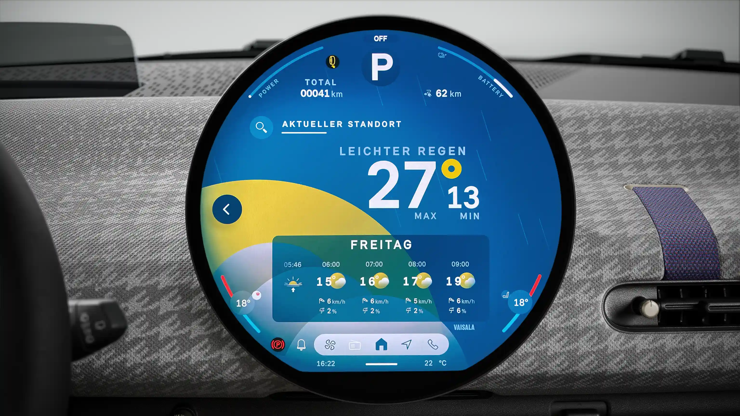ダッシュボードの中心には、まったく新しい円形センター・ディスプレイがあります。新たなテクノロジーを搭載、メーターパネルとして機能すると同時に、車載インフォテインメントや運転支援機能へのアクセスもここで操作できます。